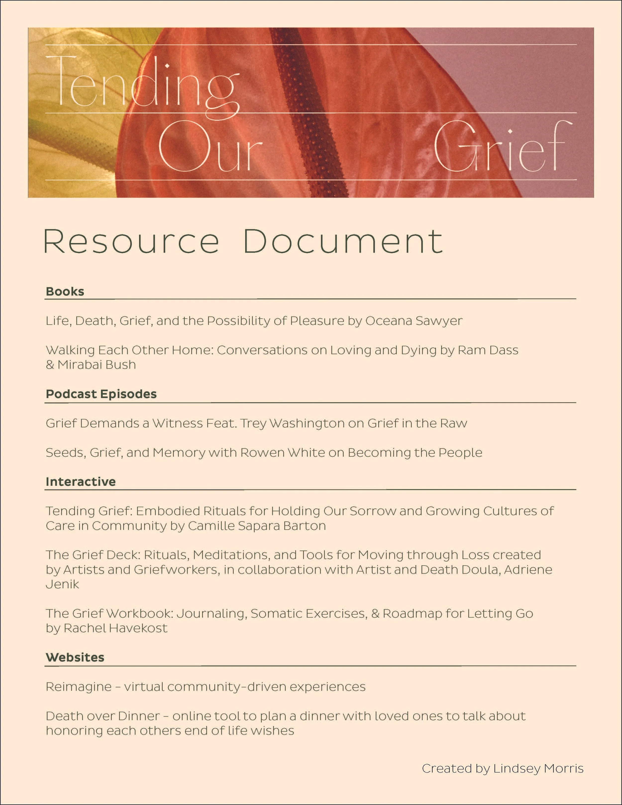This resource list was created for anyone who is grieving and would like support exploring the emotions that come up independently, relationally, and in community. The document includes linked readings, podcast episodes, and interactive tools that offer guidance for navigating grief with care and compassion.